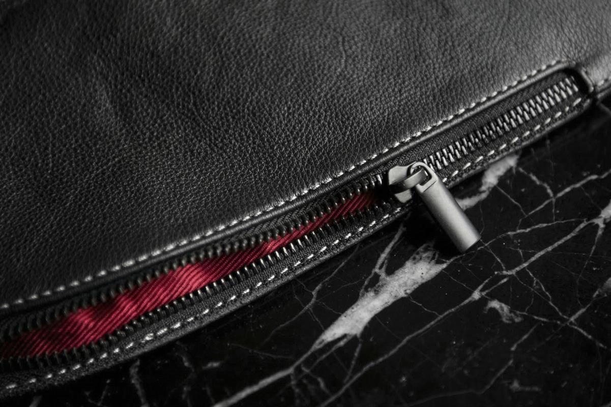 Realizzata in pelle full-grain con hardware nero opaco e lining interno rosso profondo.